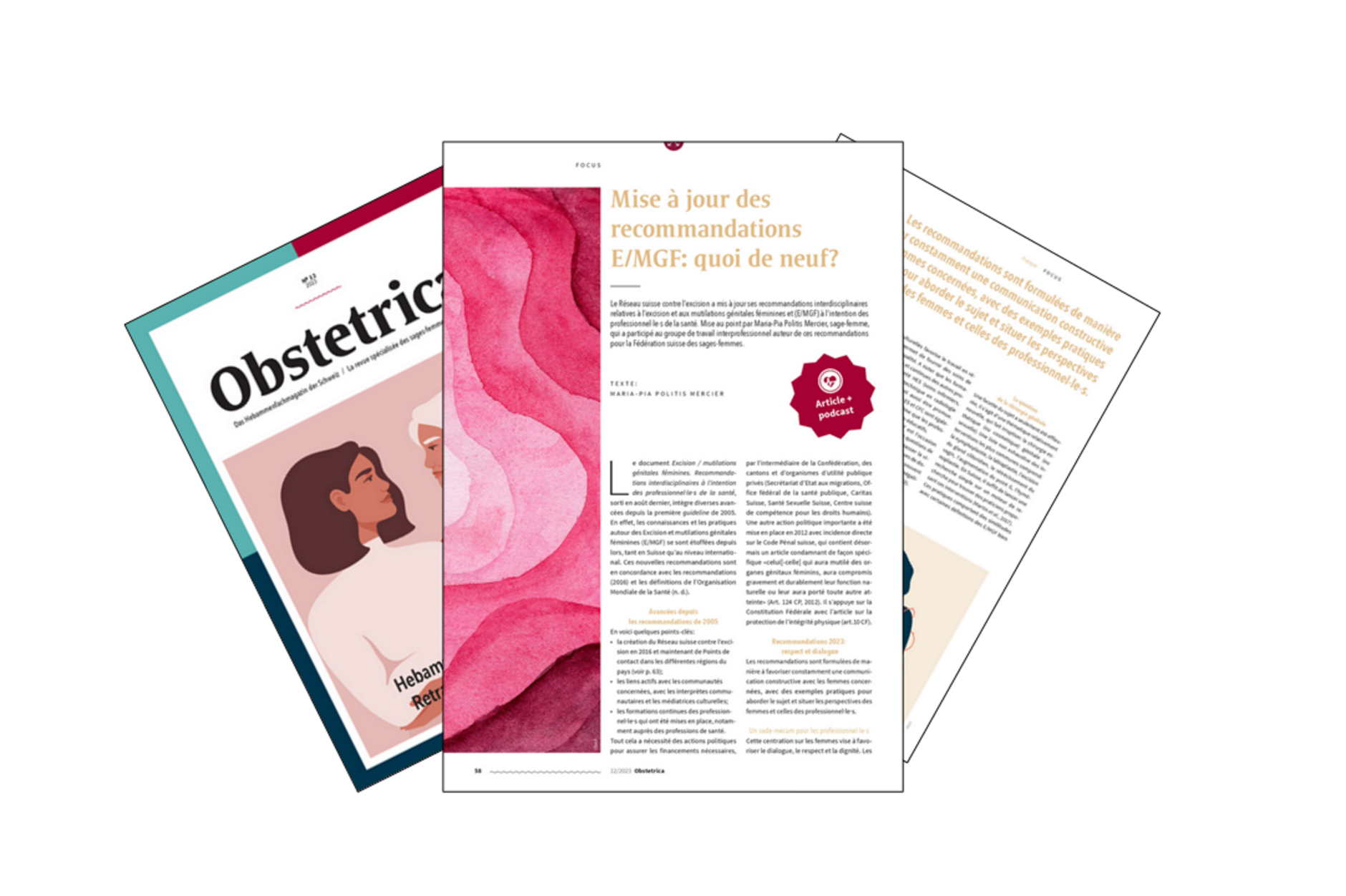 Dans son numéro de novembre 2023 (12/2023), « Obstetrica », la revue spécialisée des sages-femmes, Maria-Pia Politis-Mercier et Arianne Lachance, sages-femmes et spécialistes des mutilations génitales féminines, expliquent ce qui a changé dans les recommandations interdisciplinaires révisées relatives à l’excision destinées aux professionnel.le.s de santé.
